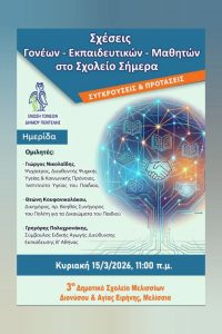 Μια άκρως επίκαιρη ημερίδα με θέμα τις σχέσεις μεταξύ γονέων – εκπαιδευτικών – μαθητών διοργανώνει η Ένωση Γονέων Πεντέλης.