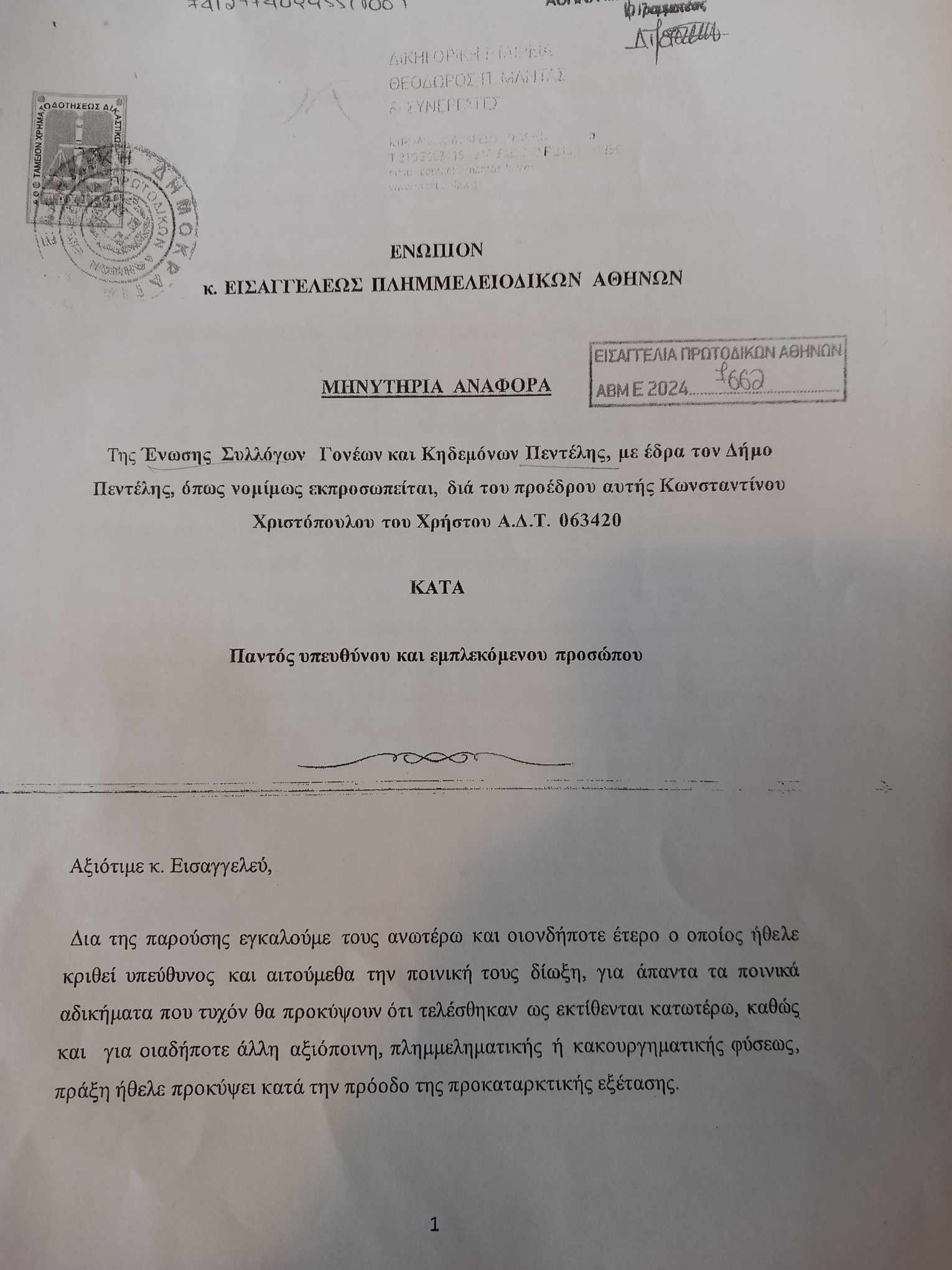 «Την Δευτέρα 25/11/2024, εκ μέρους της Ένωσης Συλλόγων Γονέων και Κηδεμόνων Δήμου Πεντέλης, ο πρόεδρος του ΔΣ, Κωνσταντίνος Χριστόπουλος με τον πληρεξούσιο δικηγόρο, κ. Θεόδωρο Μαντά και τους συνεργάτες του, καταθέσαμε μήνυση κατά παντός υπευθύνου για παράβαση καθήκοντος, εμπρησμό, καταστροφή περιβάλλοντος, έκθεση σε κίνδυνο κ.α. για την πυρκαγιά της 11ης Αυγούστου 2024, που κατέκαψε την Πεντέλη.