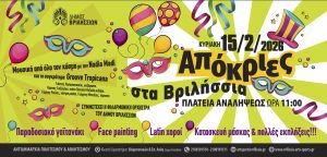 Την Κυριακή 15 Φεβρουαρίου στις 11 το πρωί φοράμε τις μάσκες, τις στολές μας, εφοδιαζόμαστε με σερπαντίνες, χορεύουμε και διασκεδάζουμε στην Βριλησσιώτικη Αποκριά στην πλατεία Αναλήψεως!»