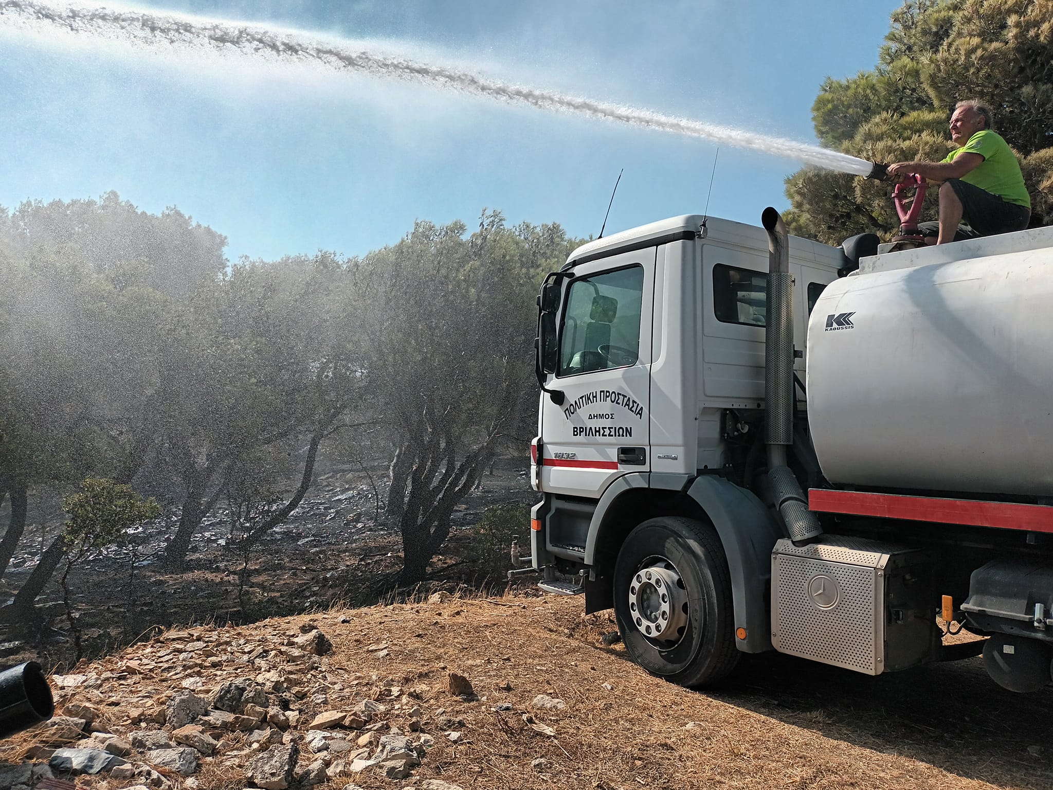 μετά από 2 χρόνια παροπλισμού, με πλήρωμα τον υπεύθυνο Πολιτικής Προστασίας Αλέκο Κοντομάρη και τον αντιδήμαρχο Πολιτικής Προστασίας Γιάννη Μπήτα, το Πυροσβεστικό ‘’Βριλήσσια 2’’ τύπου Ford Ranger χωρητικότητας 1000 λίτρων με πλήρωμα τους Στέλιο Ανεμογιάννη, Δημήτρη Νασιώτη, Στεφανία Αλεξίου και Σπύρο Κοντομάρη, το Πυροσβεστικό ‘’Βριλήσσια 3’’ τύπου Mercedes χωρητικότητας 1500 λίτρων με πλήρωμα τον Θανάση Οικονομόπουλο, τη Δώρα Χαρατσάρη, τον Νίκο Καραγιώργο και τον εντεταλμένο διαχείρισης κρίσεων Παναγιώτη Αναγνώστου, την υδροφόρα ‘’Βριλήσσια 4’’ χωρητικότητας 10000 λίτρων με πλήρωμα τον Χρήστο Κοντομάρη και τον Χρήστο Παπαζαχαρία. Τις προσπάθειες συνέδραμε και δεύτερη υδροφόρα 5000 λίτρων με τον Χρήστο Δρακόπουλο, τον Σπύρο Καμπαδάκη και τον Μπάμπη Καραγκούνη.