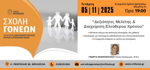 Αφιερωμένη στην ανάπτυξη των δεξιοτήτων μελέτης και τη διαχείριση του ελεύθερου χρόνου είναι η προσεχής συνάντηση της Σχολής Γονέων του Δήμου Βριλησσίων που θα πραγματοποιηθεί την Τετάρτη 5 Νοεμβρίου στις 19:00 στο 1ο Δημοτικό Σχολείο Βριλησσίων (Φλωρίνης 24).