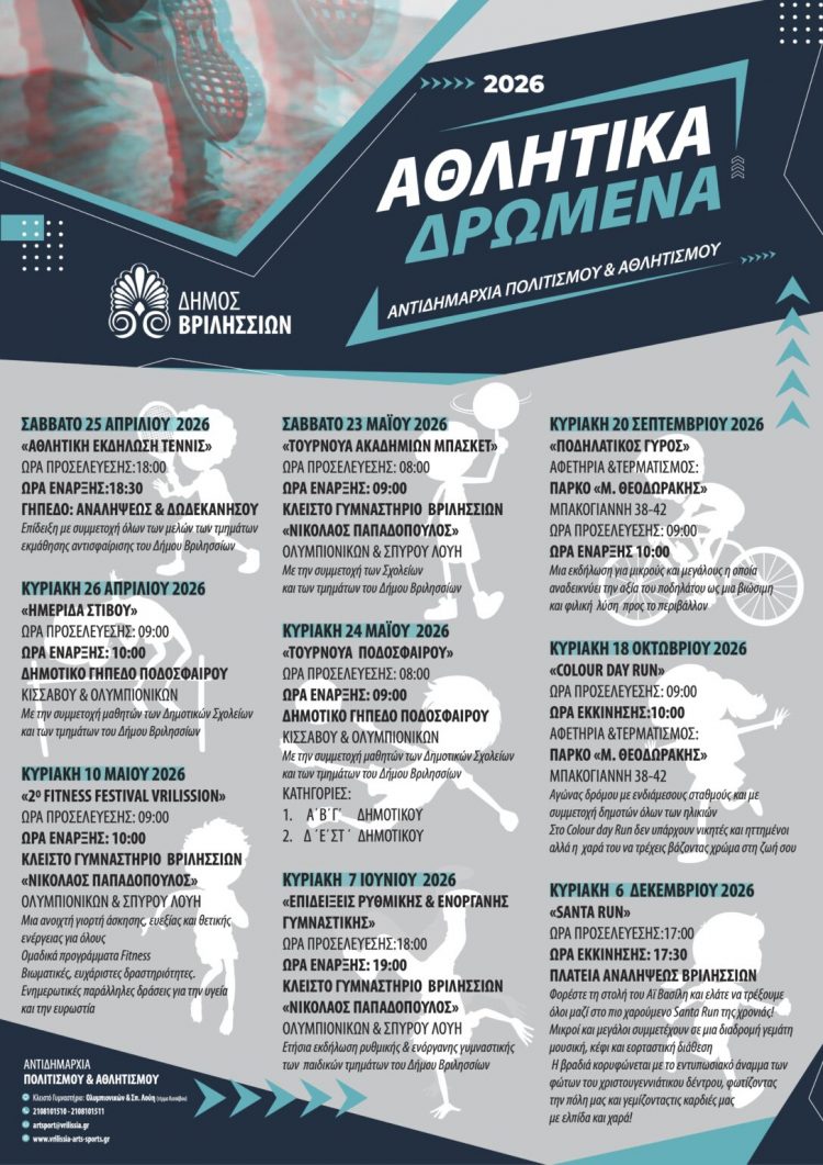 Tο πρόγραμμα των αθλητικών εκδηλώσεων για το έτος 2026, παρουσίασε η Αντιδημαρχία Πολιτισμού & Αθλητισμού του Δήμου Βριλησσίων.