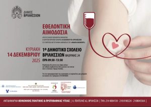 O Δήμος Βριλησσίων σε συνεργασία με τον σύλλογο εθελοντών αιμοδοτών και δωρητών οργάνων «Η Αλληλεγγύη», το Τμήμα Αιμοδοσίας του νοσοκομείου «Αμαλία Φλέμινγκ», διοργανώνουν εθελοντική αιμοδοσία στο 1ο Δημοτικό Σχολείο Βριλησσίων στην οδό Φλωρίνης 24, την Κυριακή 14 Δεκεμβρίου 2025.