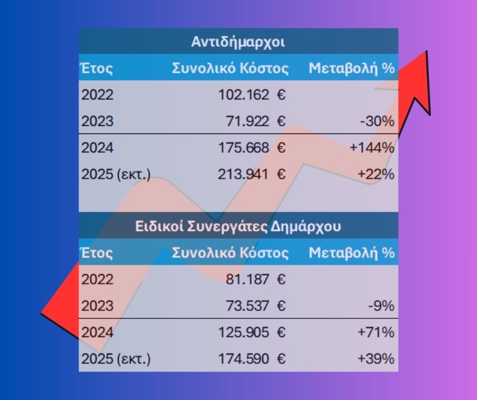 Θα αναρωτηθεί κανείς ποια έργα αφορούν αυτές οι δαπάνες. Δεν αφορούν έργα όμως. Είναι η μισθοδοσία των αντιδημάρχων και των ειδικών συμβούλων.