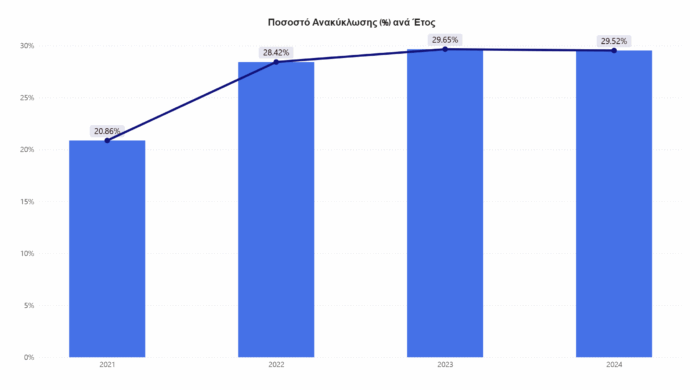 Σημειώνεται ότι ο εθνικός στόχος είναι το ποσοστό της ανακύκλωσης να φτάσει στο 60% έως το 2030, ενώ ο ευρωπαϊκός μέσος όρος, σήμερα, κυμαίνεται κοντά στο 46%.