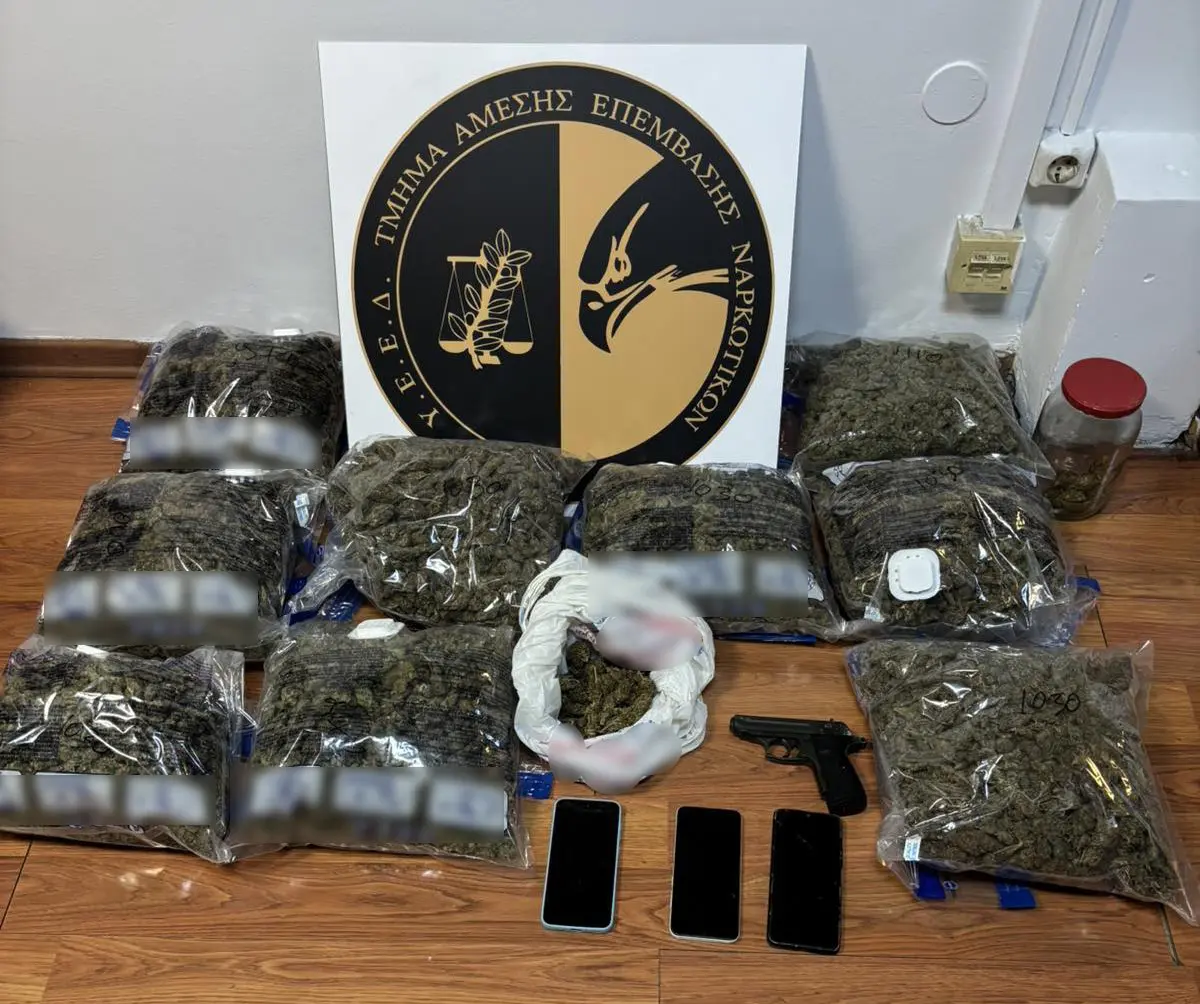 Από έρευνα που ακολούθησε στην οικία αλλά και την κατοχή του συλληφθέντα, βρέθηκαν συνολικά και κατασχέθηκαν: 9 κιλά & 172 γραμμάρια ακατέργαστης κάνναβης, ένα πιστόλι-ρέπλικα και 3 κινητά τηλέφωνα.