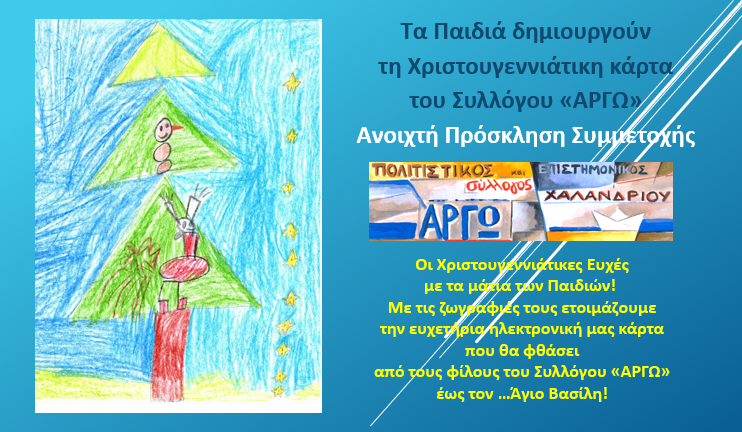 «Στο Σύλλογο “ΑΡΓΩ” τα παιδιά έχουν πάντα πρωταγωνιστική θέση, αφού αποτελούν την ελπίδα και την αισιοδοξία για το αύριο. Μέσα από τα μάτια τους ο κόσμος δείχνει ομορφότερος! Και αυτή τη χρονιά θέλουμε να δούμε τις Χριστουγεννιάτικες Ευχές μέσα από τα μάτια των Παιδιών, με τις ζωγραφιές τους να ετοιμάσουμε την ευχετήρια ηλεκτρονική μας κάρτα, που θα φθάσει από τους φίλους του Συλλόγου “ΑΡΓΩ”, έως τον …Άγιο Βασίλη! Ένα μήνυμα αισιοδοξίας, αγάπης και δημιουργίας! Η πρόσκληση απευθύνεται σε μικρούς καλλιτέχνες ηλικίας 5-12 ετών.