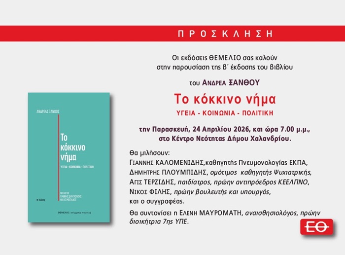Την παρουσίαση της δεύτερης έκδοσης του βιβλίου του πρώην υπουργού Ανδρέα Ξανθού «Το κόκκινο νήμα, Υγεία – Κοινωνία – Πολιτική» (εκδ. Θεμέλιο) θα φιλοξενήσει το Χαλάνδρι.