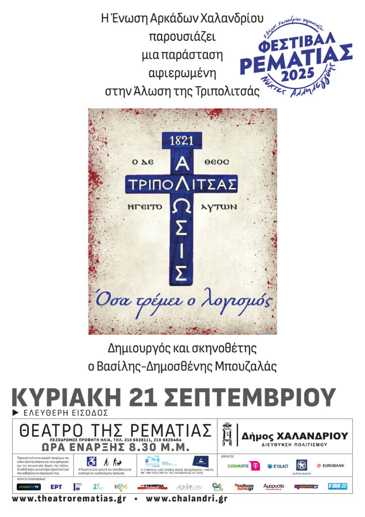 «Όσα τρέμει ο λογισμός» Η Ένωση Αρκάδων Χαλανδρίου παρουσιάζει μια παράσταση αφιερωμένη στην Άλωση της Τρίπολης. Τα ιστορικά γεγονότα αποκτούν ποιητική και θεατρική μορφή, αντλώντας κείμενα από ιστορικές πηγές και συνδυάζονται με τη μουσική και το χορό για να παρουσιάσουν τη σημαντικότερη ίσως στιγμή της Επανάστασης του 1821 για την Πελοπόννησο. Μια αναδρομή από την Άλωση της Πόλης, ως την Άλωση της Τριπολιτσάς μέσα από το θέατρο, τη ποίηση, τη μουσική και το χορό.