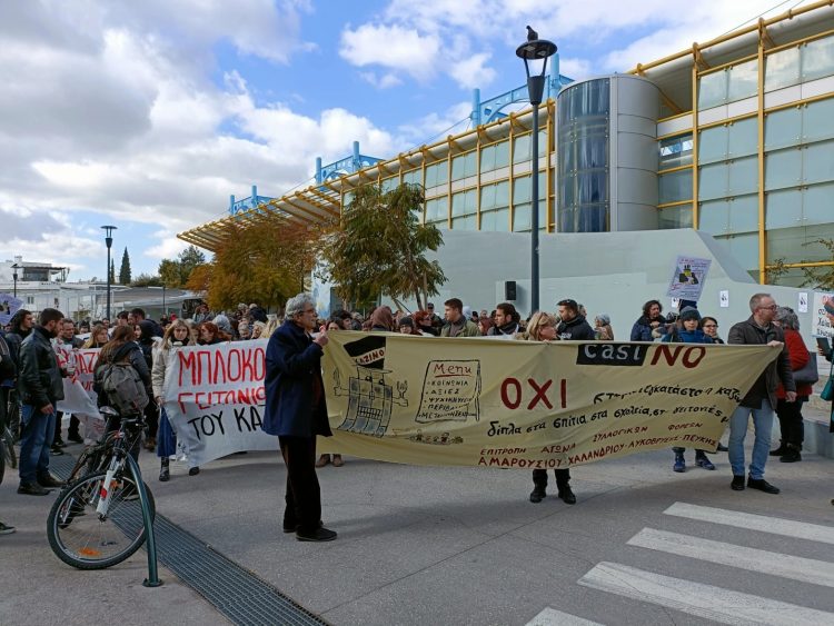 Για το επιχειρηματικό σχήμα ο χρόνος είναι χρήμα και το χρήμα – αυτό και μόνο αυτό – είναι που καθορίζει τις εξελίξεις στον τόπο μας. Για άλλη μια φορά επικρατεί ο νόμος του ισχυρού. Το πολιτικό προσωπικό, η Δικαιοσύνη, ο Τύπος, εναρμονίζονται με τη βούληση των επιχειρηματιών που έχουν κίνητρο και ζητούμενο μόνο το κέρδος. Αντιστρέφουν την πραγματικότητα με τις αμφιλεγόμενες μελέτες τους και προσθέτουν στον ήδη επιβαρυμένο χώρο της περιοχής μια βαρύτατη, υπερτοπική χρήση ενός πολυχώρου με κύρια λειτουργία εκείνη του καζίνο.